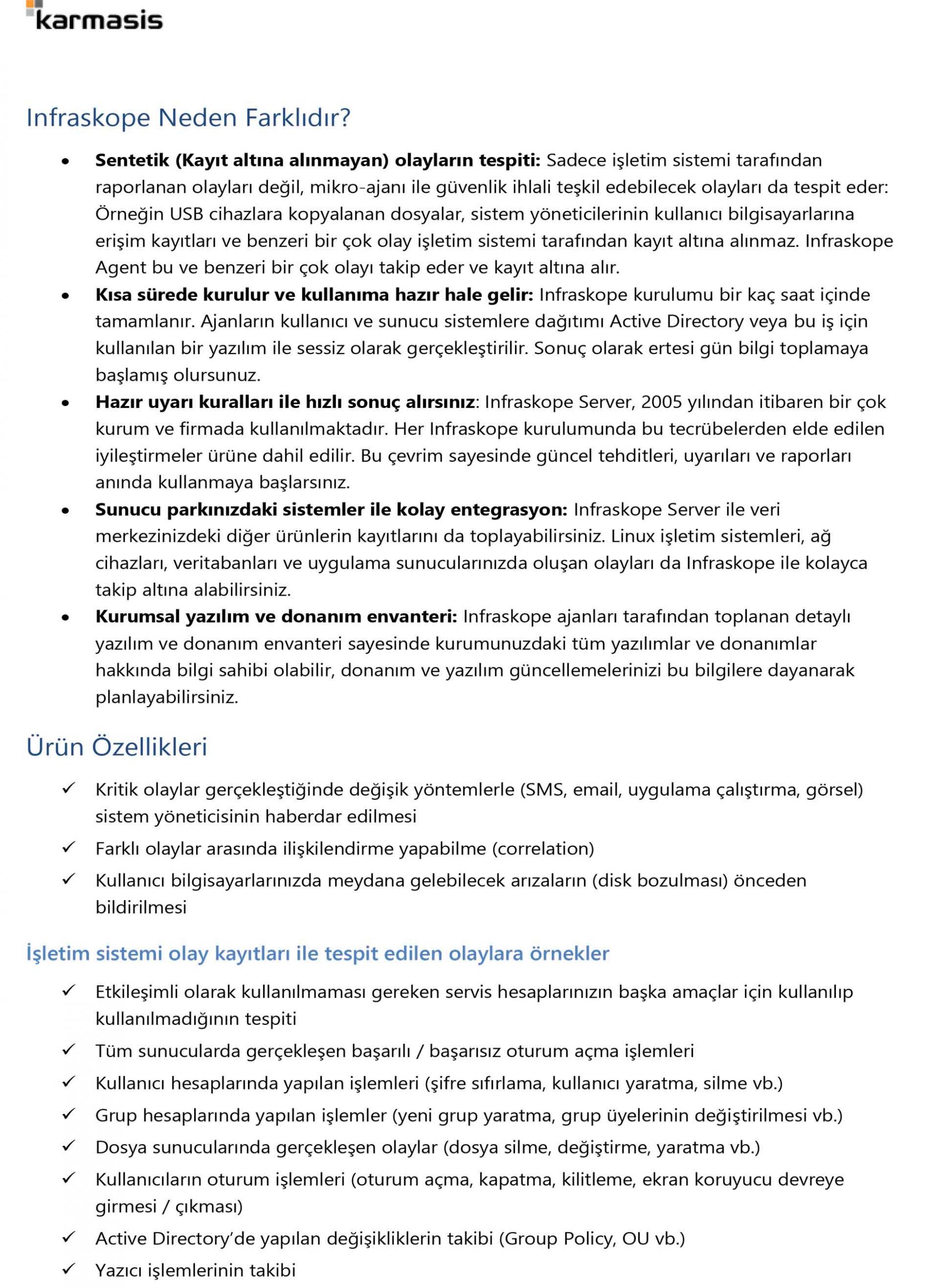 Infraskope Agent eklentisi olarak çalışmaktadır. Son kullanıcı makinelerine aktif uygulama kullanım sürelerini, kullanıcı aktivitelerinin takibi, kullanıcı hesabı denetimi, Antivirüs, Antispyware, Firewall, IE Security değerlerinin takibinin yapılmasını sağlamaktadır.
